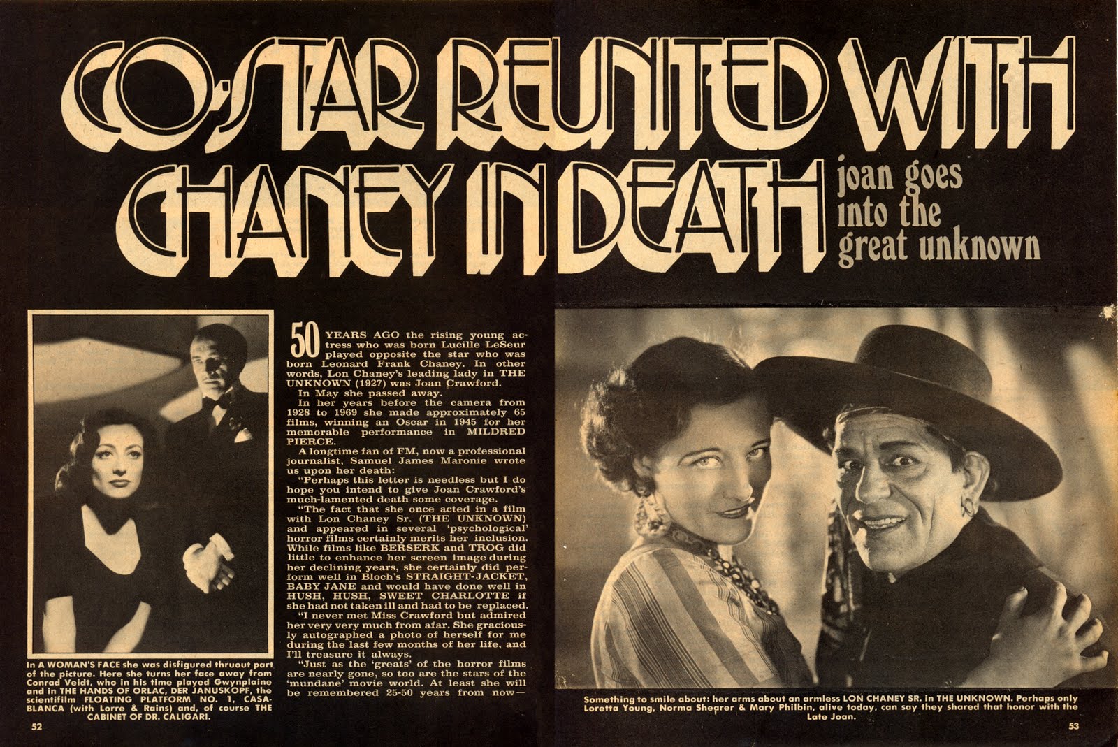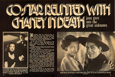 Nestes primeiros documentos para homenagear a estrela preferida de muitas gerações de fanáticos por cinema, escolhi dois recortes comentando o falecimento da estrela; um deles muito peculiar, relembrando sua parceria com Lon Chaney. A outra matéria foi publicada na extinta revista Manchete.